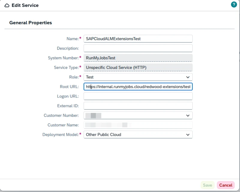 Set the Service Type to Unspecified Cloud Service (HTTP) and fill out the other required fields, Enter the base RunMyJobs URL that SAP Cloud ALM should use to redirect users to job run details, then click Save.