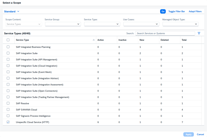 Select a scope to show by clicking the bulls-eye icon in the upper-right corner and then the Service Type Unspecified Cloud Service (HTTP).
