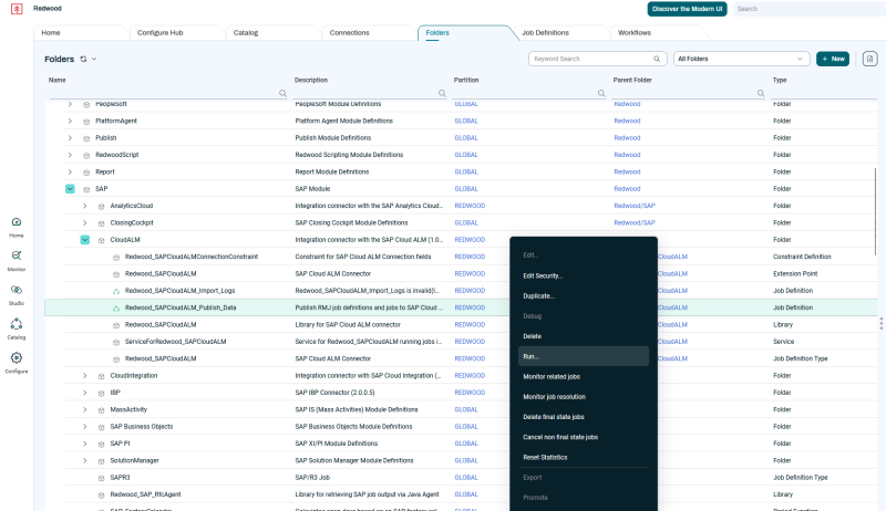 Right-click the Redwood_SAPCloudALM_Publish_Data job definition and select Run.