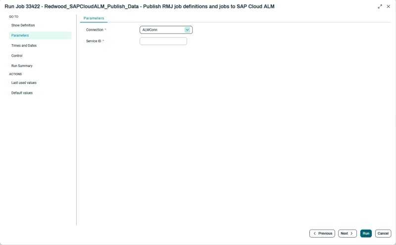The connector publishes job definitions and job execution data from RunMyJobs to SAP Cloud ALM.