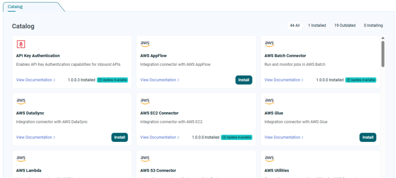 Navigate to Configure > Extensions > Catalog or click Connect in the navigation bar. The Catalog screen displays. Each of the Extensions and other Connectors available is represented by a card. You can click a card to view more details.